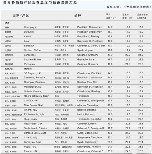 上图表中,从法国至其他地区的葡萄产区,它们是按照气候从凉爽至炎热的顺序排列下来的,每个产区列出2种主要的葡萄品种。这些数据主要来自英国著名葡萄酒评论家休·约翰逊(Hugh Johnson)和葡萄酒大师杰西斯·罗宾逊(Jancis Robinson)合著的《世界葡萄酒地图》(World Atlas of Wine,2013年第7版)一书。但是遗憾的是,这本书中没有列表中提到的澳大利亚桑雷西亚(Sunraysia)和美国加州的弗雷斯诺(Fresno)这2个产区 。