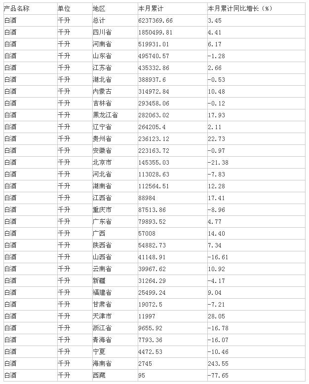 2015年1-6月生产白酒6237369.66千升,同比增长3.45%。