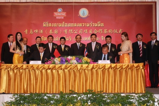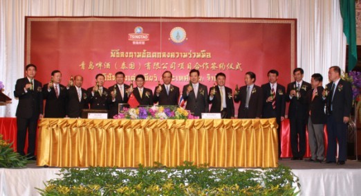 享誉世界的中国品牌--青岛啤酒,用其百年历程演绎了一部从德国引进来、从中国走出去、向世界融进去的国际化乐章。随着10月17日青岛啤酒(泰国)有限公司签约仪式在曼谷的举行,青岛啤酒国际化乐章的第三部曲正式拉开了序幕。青岛啤酒(泰国)有限公司预计年产啤酒20万千升,计划于2013年正式建成投产。