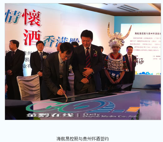 5月26日上午,海航易控股与贵州怀酒股权合作仪式、中行贵州省分行与海航易控股战略合作协议签约仪式、贵州海航酒业有限公司挂牌仪式在贵阳举行,宣告海航集团正式入主贵州怀酒,以现代化的营销手段打造贵州白酒产业新贵。