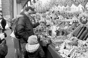 11月15日,在捷克西部兹比罗赫城堡举行的圣马丁葡萄酒节上,一名男子和他的孩子在一个展销台前选购工艺品。人们在这里品尝当年新酿的葡萄酒,辞别秋季,迎接冬季的到来。葡萄酒节上还展销各种捷克民族工艺品,并有民间艺人进行表演。 新华社记者孙希有摄