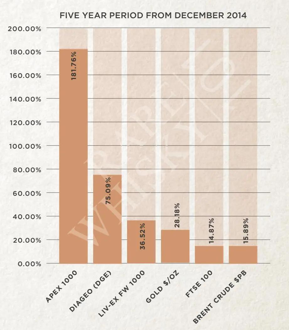 2020年RW101发布的最近5年 威士忌、葡萄酒、黄金及原油等升幅对比