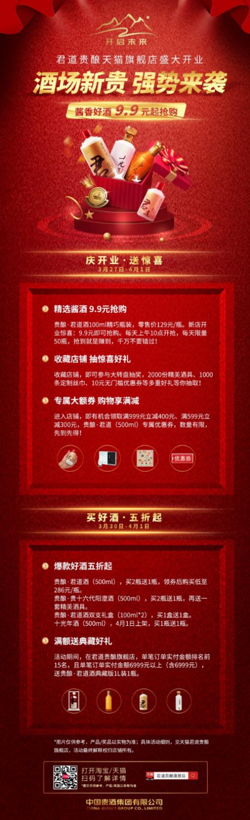 2020年3月27日,经过精心的策划与筹备,中国贵酒集团有限公司鼎力支持的“君道贵酿旗舰店”正式入驻天猫商城。既能享受线下的优质服务,又能享受网上渠道的优惠价格,自此,广大白酒爱好者们又多了一个品尝到美酒的途径。