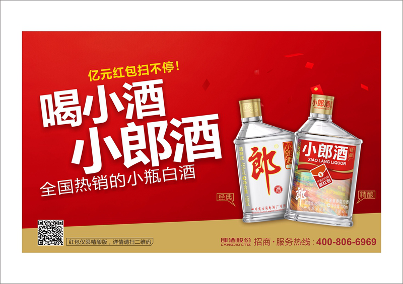 郎酒旗下的小郎酒是全国所有小酒品牌中唯一拥有专利技术的小酒,小郎酒瓶型延续家族传统,整体呈扁平椭圆状,颈部向左倾斜,造型新颖别致,易于手持,是郎酒首创推出的经典瓶型。新包装瓶盖别具一格,设有内外两个瓶盖,识别性强,卫生实用,更适合直饮。新包装主体画面设计,由正标、透标、背标三个主体部分组成,也是心意满满。