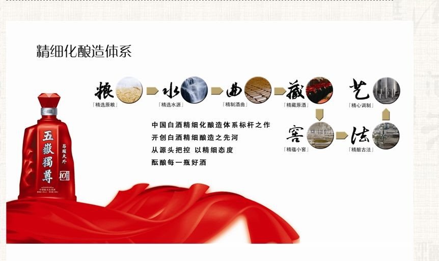 五岳独尊承袭世代古法,精选泰山原产地的优质小麦、大麦、豌豆为原料,严格限定制曲时间,聚春夏之精,以天曲为媒。曲成之后,置于恒温地室培养,助力酒曲发酵成熟,再经样品采集、富集培养、纯种分离、性能测定、编号保藏,直至制曲挂衣,多层严格把关,保证曲优而后成酒香;精密计算发酵周期,采取双重工艺,既承继传统的混蒸混烧老五甑工艺,又兼有少量清蒸混烧工艺;泰山酒业将非物质文化遗产——泰山酒传统酿造技艺与航天育种完美缔合,在继承中发展,在发展中创新,以时间酝酿芬芳,成功造就极致之品。