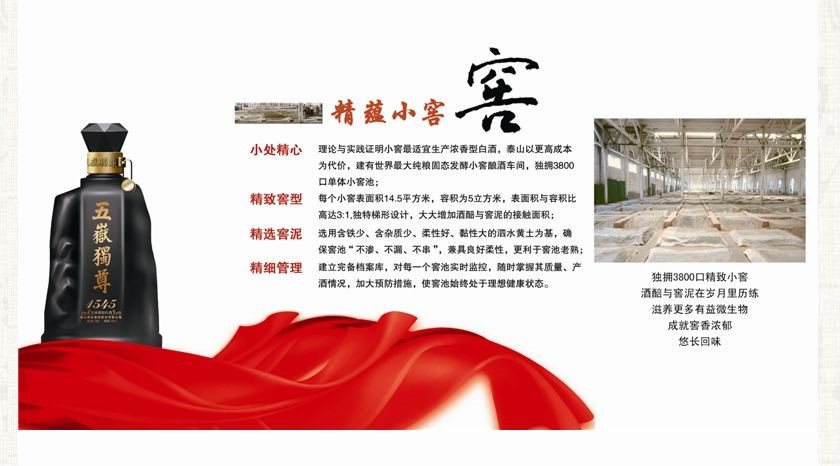 理论与实践证明,小窖最适宜生产浓香型白酒,泰山酒业以更高成本为代价,建成了世界上最大纯粮固态发酵小窖酿酒车间,3800口单体小窖池,每个小窖表面积14.5平方米,容积为5立方米,表面积与容积比高达3:1,独特的梯形设计,大大增加了酒醅与窖泥的接触面积,选用含铁少,含杂质少、柔性好、黏性大的泗水黄土为基,确保窖池“不渗、不漏、不串”。酒醅与窖泥在岁月里历练,滋养出更多有益微生物,独一无二的皇家小窖,成就五岳独尊的窖香浓郁。